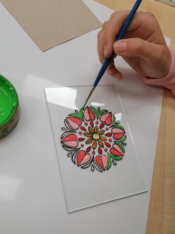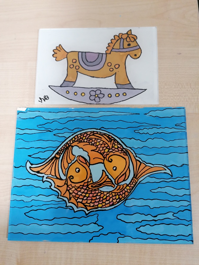Na kurze si deti osvoja techniku maľby na sklo a namaľujú si reprodukcie, ako aj obrázky podľa vlastného návrhu.