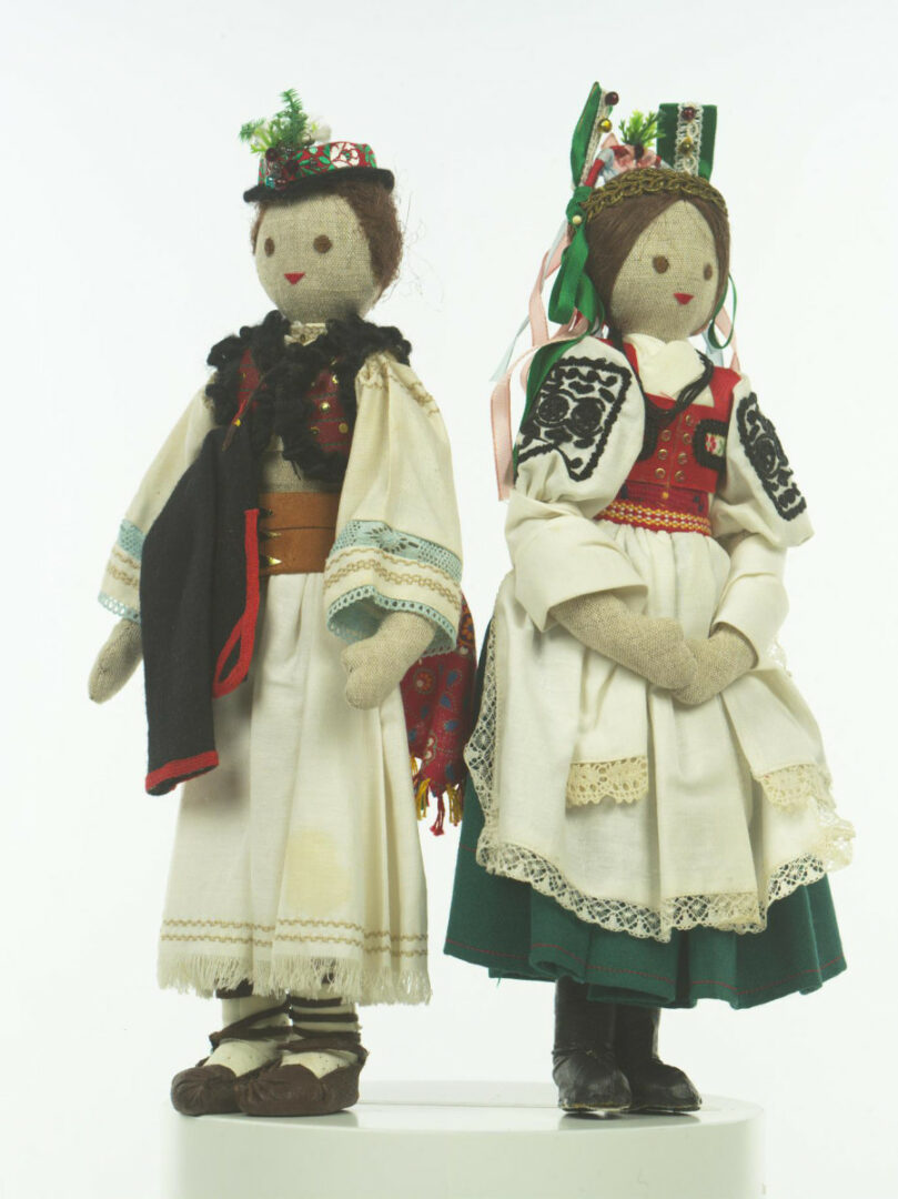 Svadobný pár, Poniky, okres Banská Bystrica Pre nevestu z Poník je charakteristická čierna výšivka na oplecku, zelená sukňa a biela zástera. Neodmysliteľnou súčasťou oblečenia je odiedzka preložená cez ruky a parta so stuhami. Ženíchov sviatočný odev (krátka košeľa, široké nohavice, široký kožený opasok, kožúšok, šatka olejka) dopĺňalo pierko na klobúku a kabanička. Nevesta ma obuté čižmy, ženích má obuté krpce s onucami.