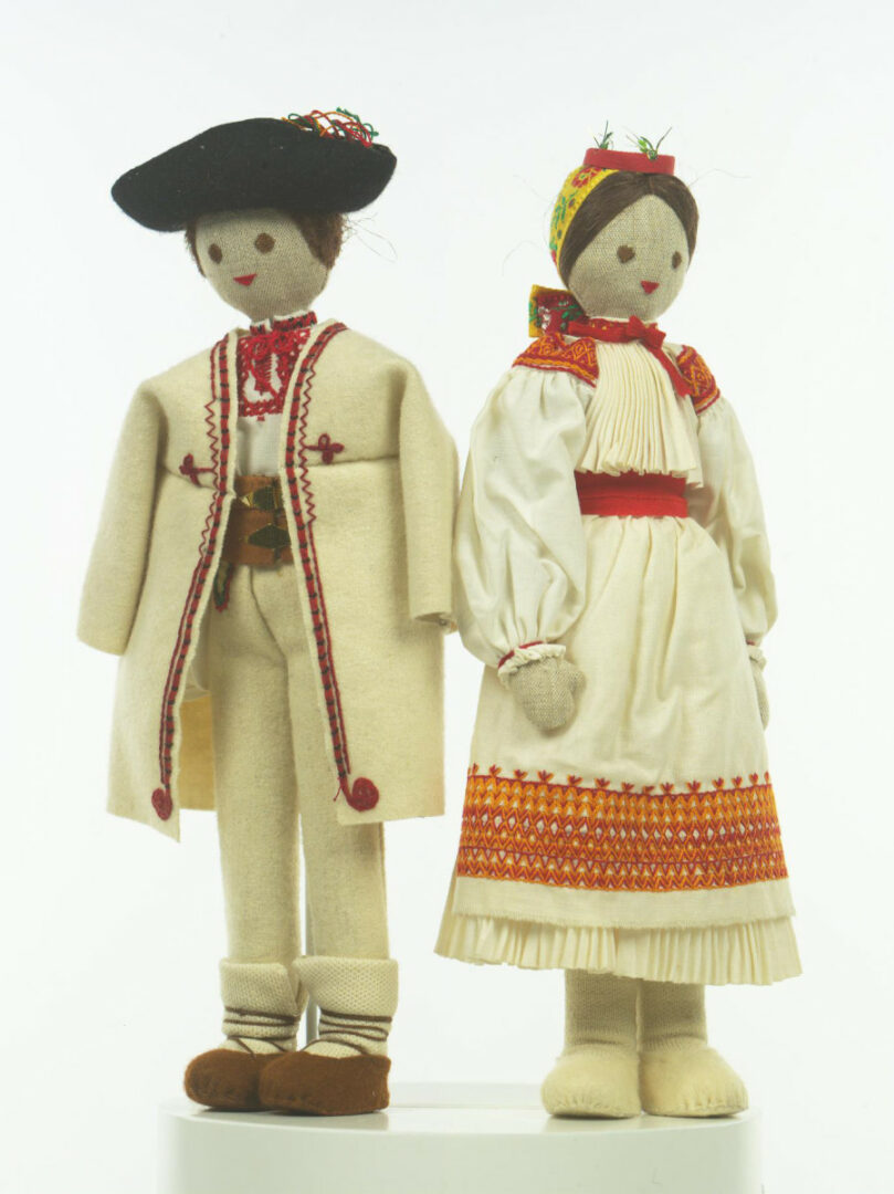 Svadobný pár, Zliechov, okres Ilava Nevesta má oblečený rubáš, skladanú sukňu, zásteru, oplecko so skladanými stanmi a červený pletený pás. Obuté má pančušky a súkenné papuče. Charakteristickým znakom nevesty je korunka a červeno-oranžová farba výšivky. Ženích má oblečený sviatočný odev s vyšívanou košeľou. Ďalej má oblečné súkenné nohavice, súkennú huňu a široký kožený opasok. Na hlave má klobúk, na nohách má kopytcia a papuče.