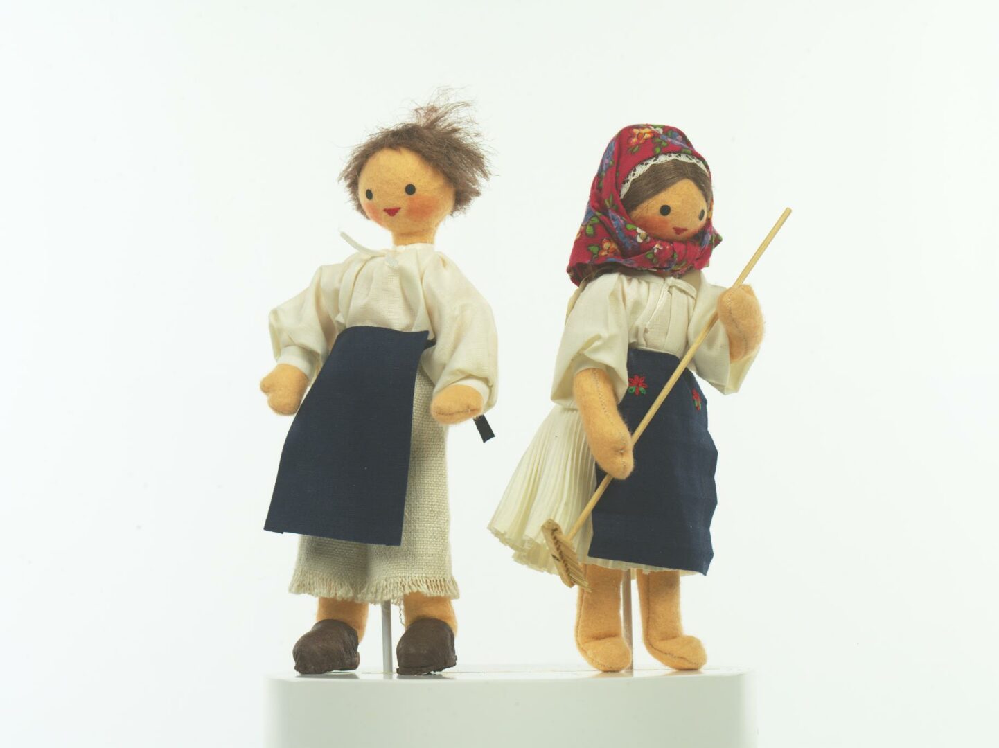 Pár krojovaných bábik, ktoré štylistickým spôsobom prezentujú pracovný odev zo Sládečkoviec. Na odeve sú zachytené typické znaky z daného regiónu.