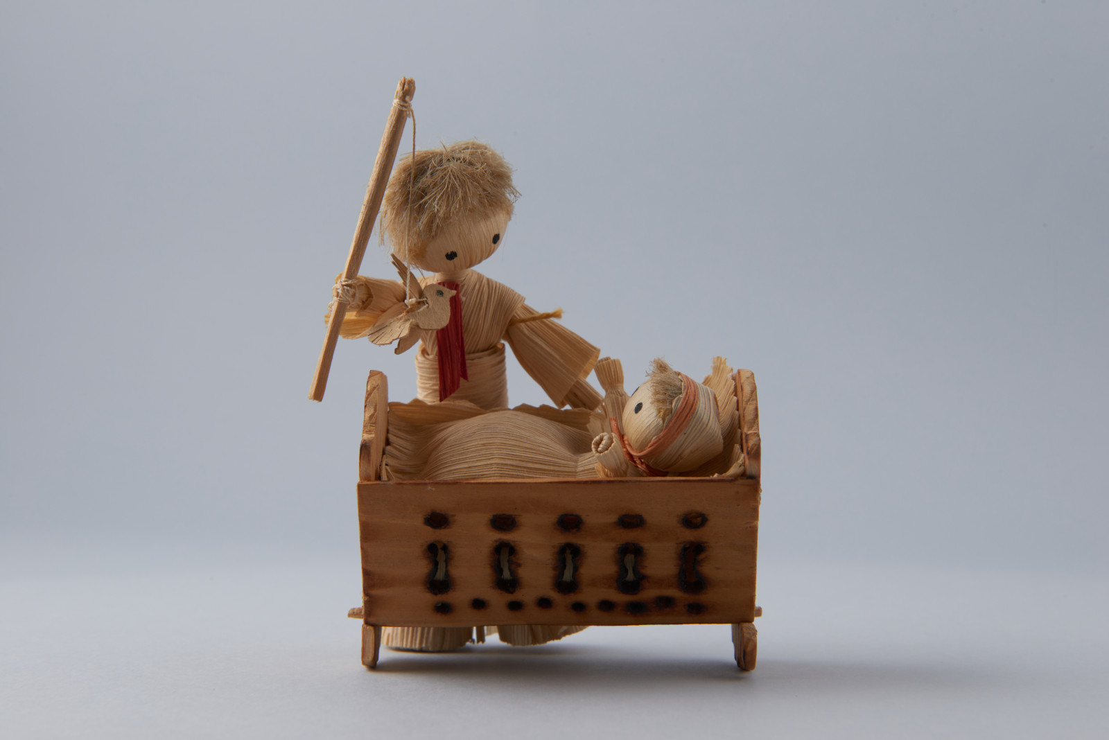 Bábika z kukuričného šúpolia – chlapec sa skláňa nad drevenou kolískou, v ktorej je malé dievčatko. V ruke drží na palici zavesenú papierovú holubicu.