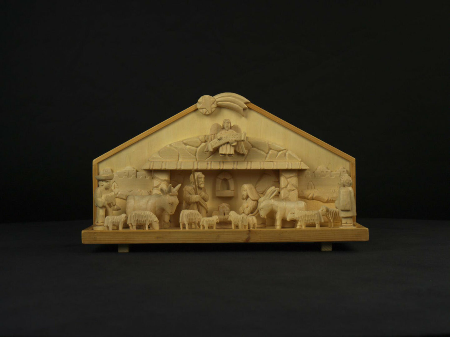 Betlehem stredný prírodný: vyrezávaný z dreva prírodnej farby – zloženie: na plochom podstavci obdĺžnikového tvaru prístrešok s hviezdou a anjelom v zlome strechy. Figúrky: Ježiško v jasličkách, 4 postavy (Jozef, Mária, 2 starci), 10 zvieratiek. Spolu 15 ks figúriek a 1 jasličky.