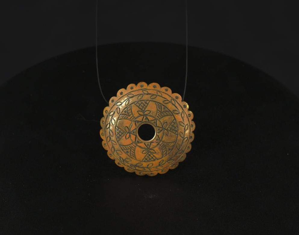 Brošňa mosadzná, tepaná, okrúhleho tvaru, zdobená vyrazenými rastlinnými ornamentálnymi motívmi. Okraj brošne ozdobne profilovaný (oblúčikovitý).