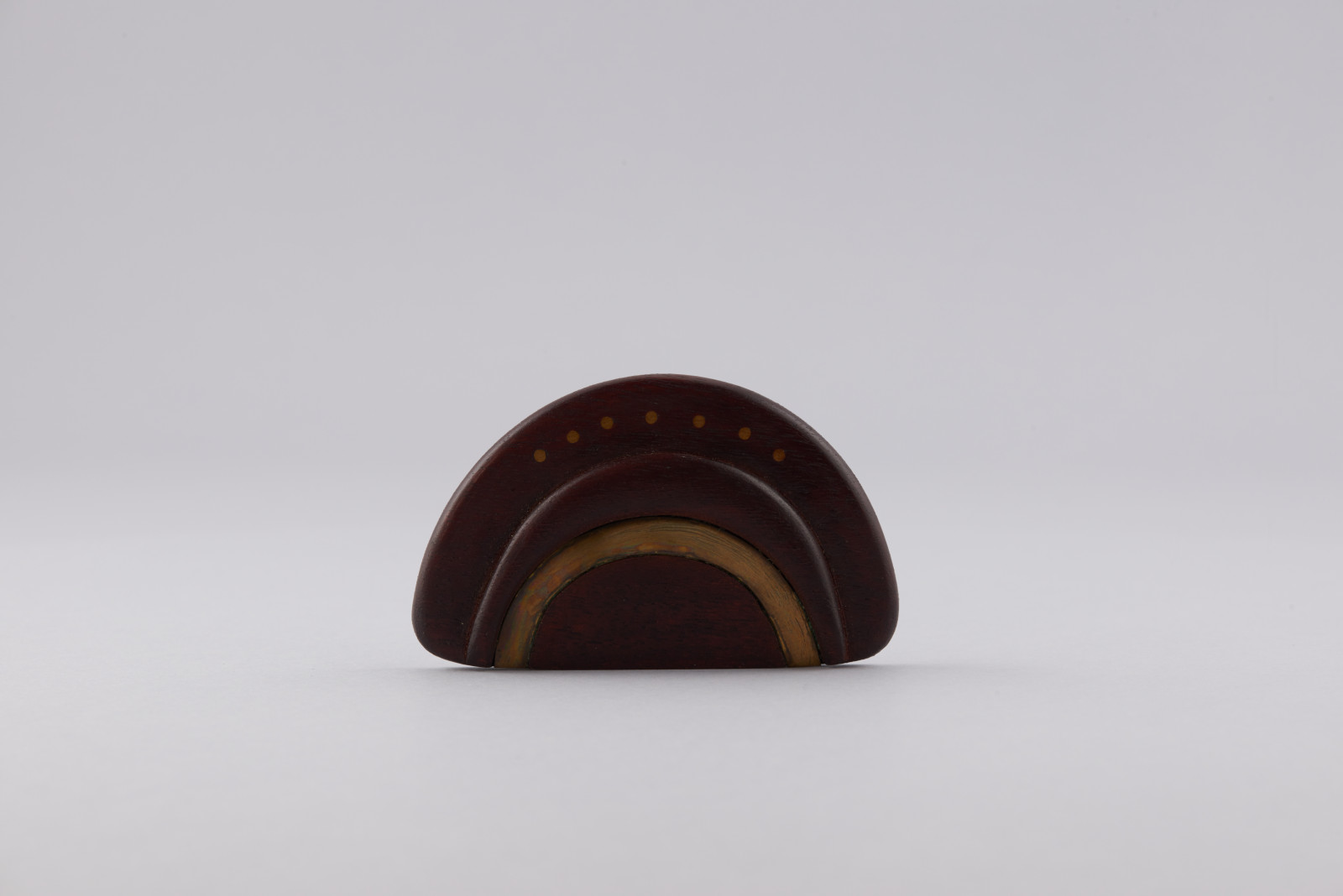 Ručne vyrezávaná brošňa z orechového dreva v tvare poloblúka, zdobená intarziou z mosadze.