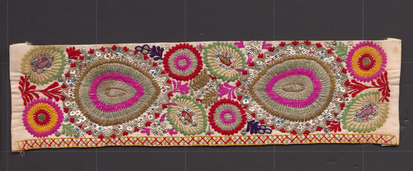 Čelenka je z tenkého plátna (šifónu) podloženého hrubším továrenským plátnom. Plocha čelenky je vyšitá podľa predkreslenia. Použitý je plný plochý a stonkový steh, na jednom okraji je krokvička. Výšivka je doplnená našitými flitrami a korálkami, a kovovou špirálkou. Výšivka je šitá hodvábnou a kovovou niťou.