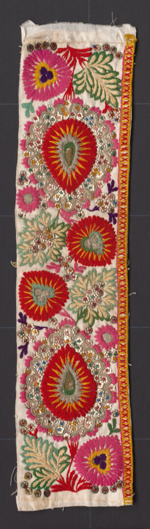 Čelenka je vyšitá cez dve vrstvy plátna. Predkreslená výšivka je šitá hodvábnou priadzou a kovovou niťou. Použitý je plný plochý a stonkový steh. Doplnená je našitými flitrami, korálkami a špirálkou z kovovej nite.