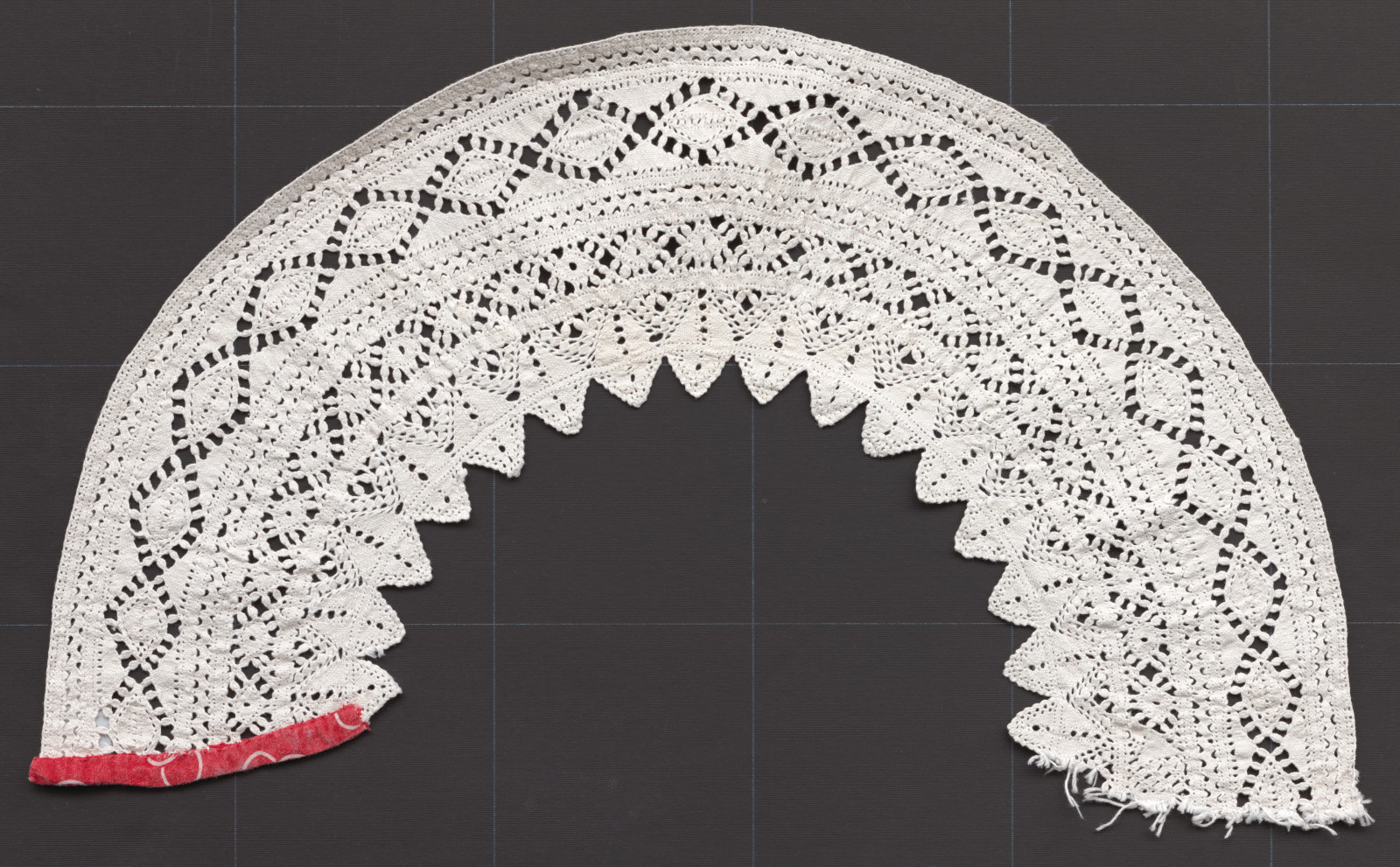 Čelenka je upaličkovaná do oblúka z hrubšej bavlnenej priadze, vo vnútornom oblúku sú vytvorené zúbky. Jeden koniec je zapracovaný pásikom červeného vzorovaného kartúnu V 19 storočí bola čipka rovná, až v 20.storočí sa paličkovala do oblúka.