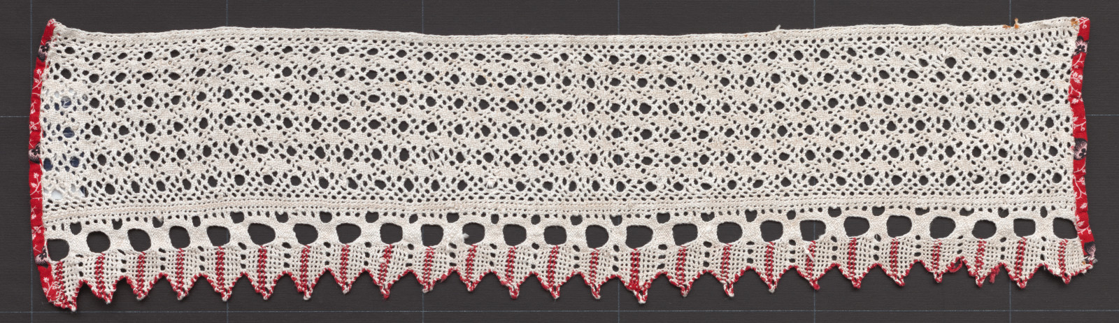 Čipka, ktorá tvorila čelenku čepca, je upaličkovaná z bielej bavlnenej priadze, na okraji zúbkov je použitá aj červená farba. Konce čipky sú ručne zapracované pásikom farebného kartúnu.