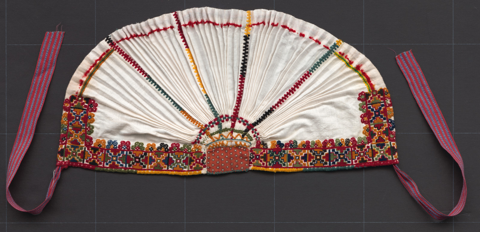 Čepiec je z piatich častí továrenského plátna, vyšívané časti sú z hrubšieho, ostatné z tenšieho. Jednotlivé časti sú zošité spojovacím švíkom. Horná časť je nariasená a zošitá s malým obdĺžnikom kartúnu. Riasenie je spevnené výšivkou. Čepiec je vyšitý vlnenou priadzou podľa počítania nití. Použitý je steh krížikový, retiazkový a slučkovací. Na dolnej časti je ušitý prehyb, v ktorom je navlečená šnúrka.
