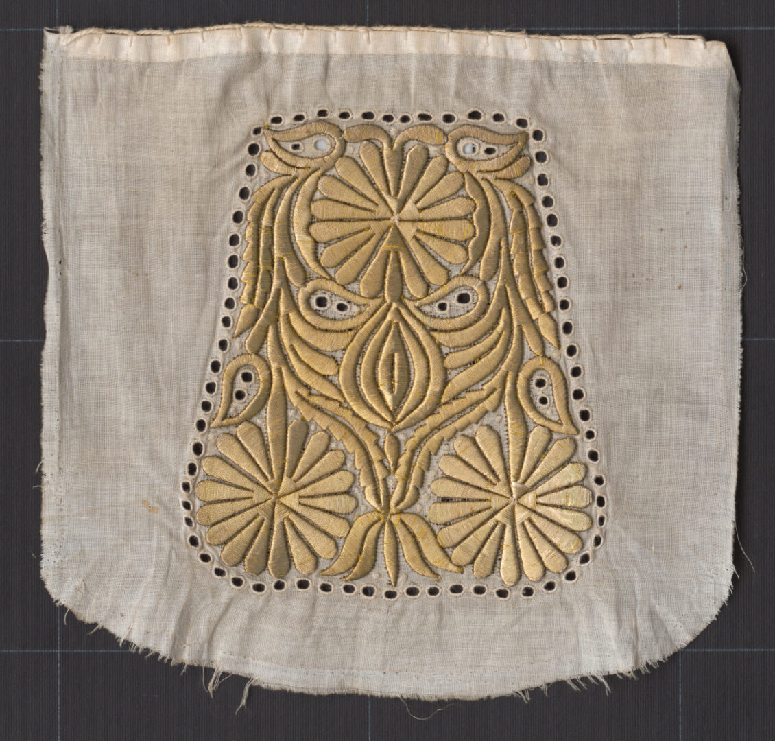 Dienko a čelenka tvorili jeden čepiec. Zhotovené sú z bieleho vaperu, na ktorom je nášivka zlatou niťou cez kartón, doplnená je bielou dierkovou výšivkou.