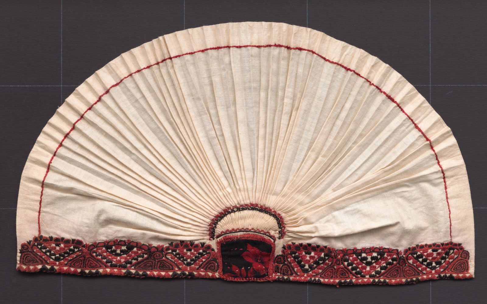 Čepiec z jedného kusa továrenského plátna má svoju nariasenú časť zošitú s malým obdĺžnikom vzorovaného kašmíru. Riasenie je spevnené výšivkou. Výšivka na čepci je šitá nezosúkaným hodvábom a šitá je podľa predkreslenia. Na výšivke je použitý stonkový steh, slučkovací a úsporný plný steh, ktorý sa riadi niťami plátna.