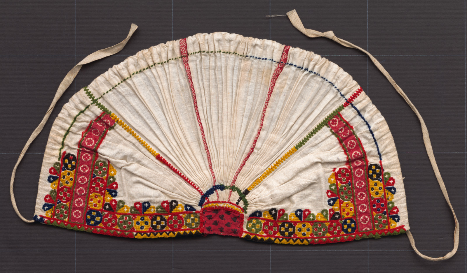 Čepiec z 5 obdĺžnikov továrenského plátna má tri časti zošité pomocou továrenskej tkanice. Predné obdĺžniky sú z hrubšieho plátna, je na nich výšivka podľa počítania nití. Nariasená časť čepca je zošitá s obdĺžnikom vzorovaného kartúnu. Výšivka je šitá vlnenou priadzou. Použité stehy: krížikový a retiazkový. Predný okraj čepca je obslučkovaný. Výšivku dopĺňa našitá továrenska tkanica. Na dolnej časti je ušitý prehyb, v ktorom je navlečená keprovka.
