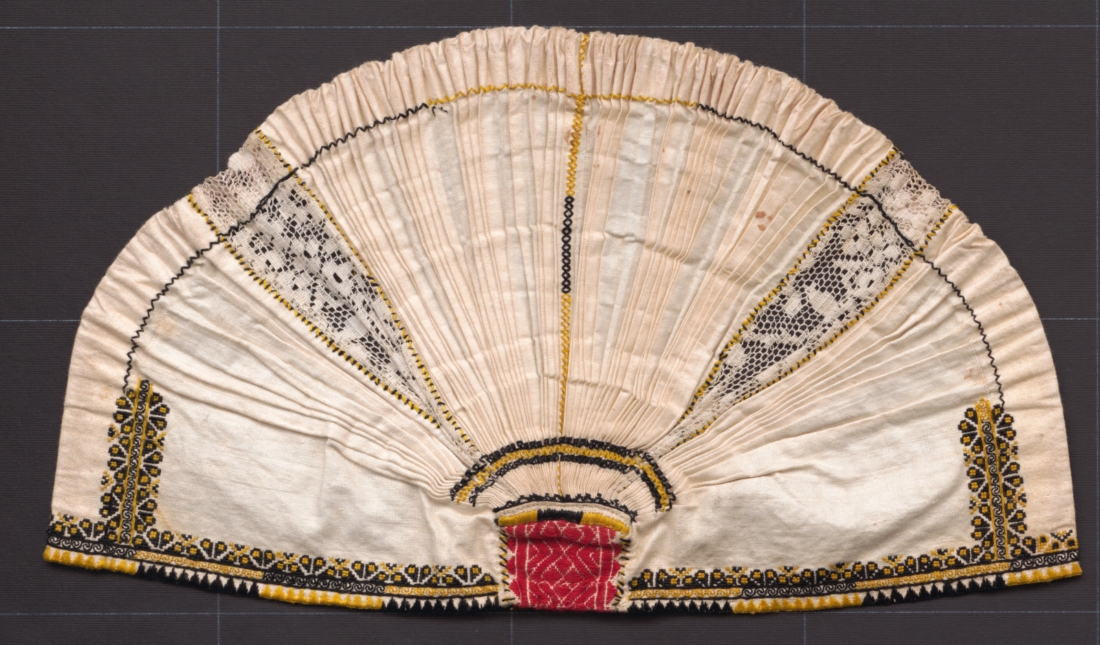 Čepiec je zo 4 obdĺžnikov továrenského plátna, dva sú zošité spojovacím švíkom, medzi ďalšie dva je vložený pásik bavlnenej záclonoviny. Vyšívacou priadzou je nezosúkaná hodvábna priadza. Horná časť čepca je nariasená a zošitá s obdĺžnikom z továrenskej tkanice. Riasenie je spevnené výšivkou. Výšivka na prednej časti čepca je šitá krížikmi a retiazkou a zadným stehom. Predný okraj je obslučkovaný. Na dolnej časti je ušitý prehyb na navlečenie šnúrky.
