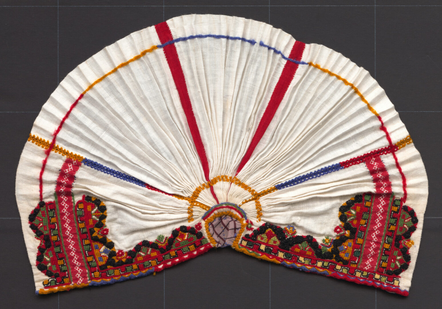 Čepiec je ušitý z bavlneného plátna, hrubšieho a tenšieho. Na hrubšom je urobená výšivka, ktorá je šitá vlnenou priadzou. Použité stehy: krížikový, slučkovací, zadný, krivinka. Medzi výšivku je našitá továrenska tkanica.Tri časti tenšieho plátna sú zošité za pomoci úzkych pásikov zástavoviny, vyšívané časti sú zošité s ostatnými spojovacím švíkom. Nariasené časti čepca sú zošité s malým obdĺžnikom vzorovaného kartúnu. Na dolnej časti je ušitý prehyb.