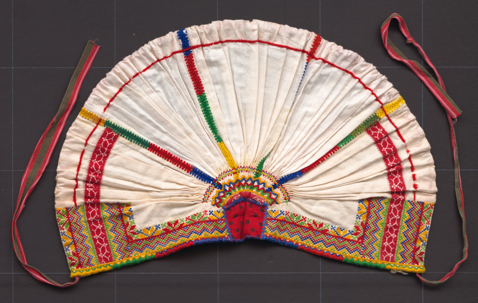 Čepiec je z 5 obdĺžnikov továrenského plátna, ktoré sú zošité spojovacím švíkom. Tri stredové obdĺžniky sú z tenšieho plátna, okrajové z hrubšieho, aby sa na nich dala urobiť výšivka podľa počítania nití. Horná časť čepca je nariasená a zošitá s obdĺžnikom z potlačeného kartúnu. Riasenie je spevnené výšivkou.Výšivka na prednej časti čepca je šitá krížikmi a doplnená je našitou továrenskou tkanicou. Predný okraj je obslučkovaný. Na vyšívanie je použitá vlnená priadza. Na dolnej časti je v ušitom prehybe navlečená pásiková továrenská tkanica