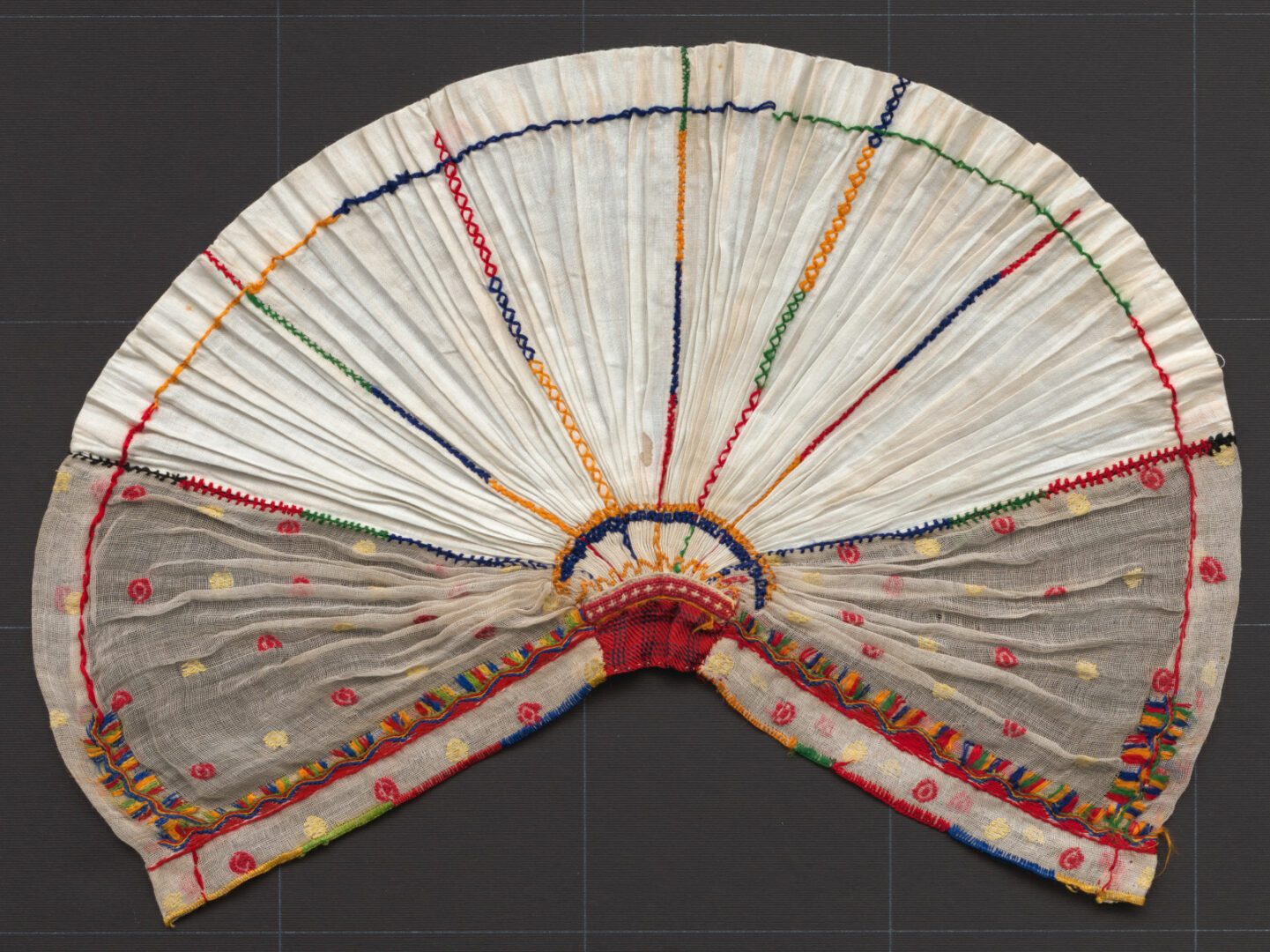 Čepiec je z 1 obdĺžnika továrenského plátna a 2 obdĺžnikov vyšívaného organtínu, ktoré sú zošité spojovacím švíkom. Obdĺžnik z plátna je členený linkami krokvičky a dvojitej krivinky na 6 častí. Vyšívacou priadzou je nezosúkaná hodvábna priadza. Horná časť čepca je nariasená a zošitá s obdĺžnikom z červenej látky. Riasenie je spevnené výšivkou. Výšivka na prednej časti čepca je šitá stonkovým a plným stehom. Predný okraj je obslučkovaný. Na dolnej časti je ušitý prehyb na navlečenie šnúrky.