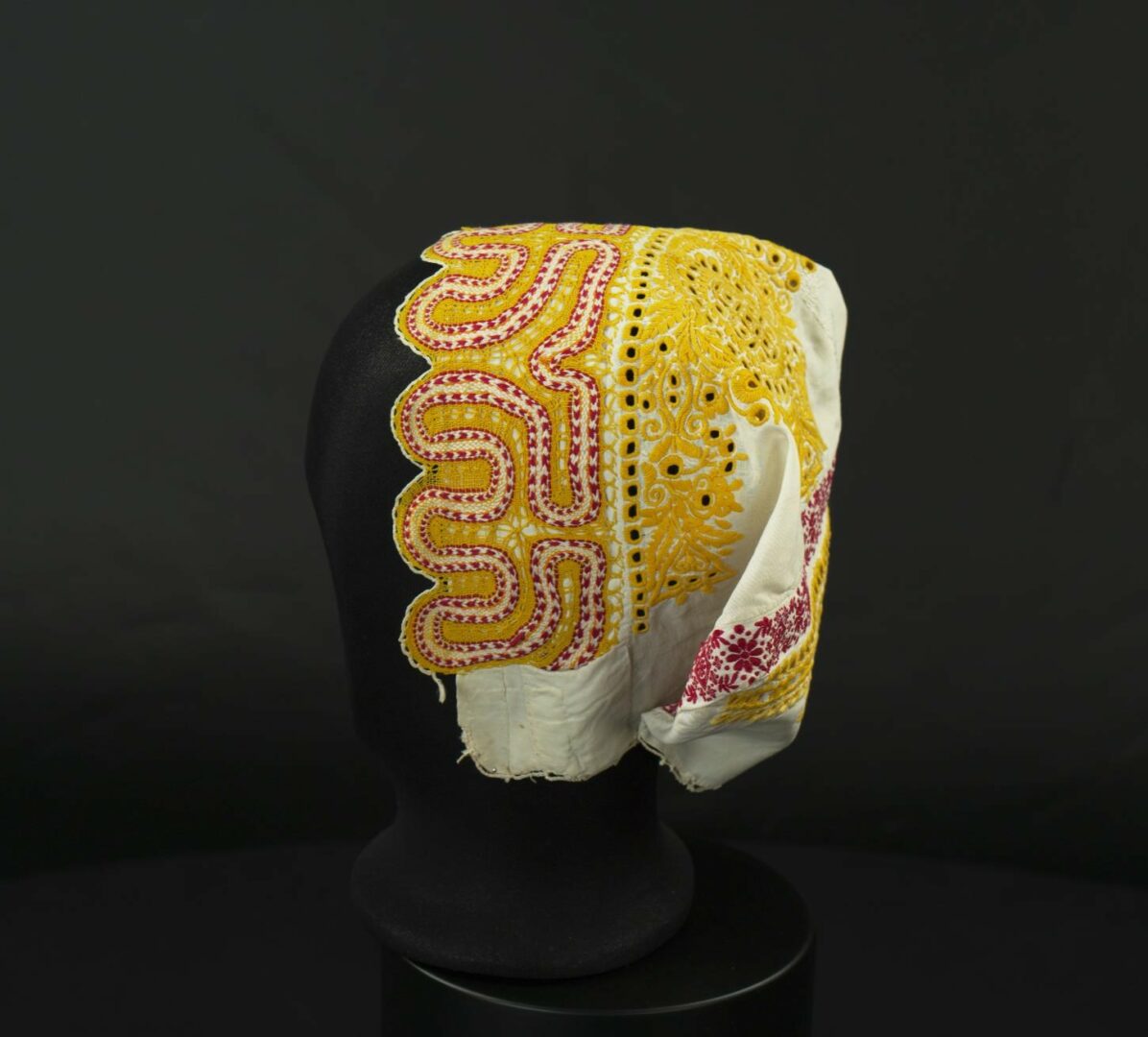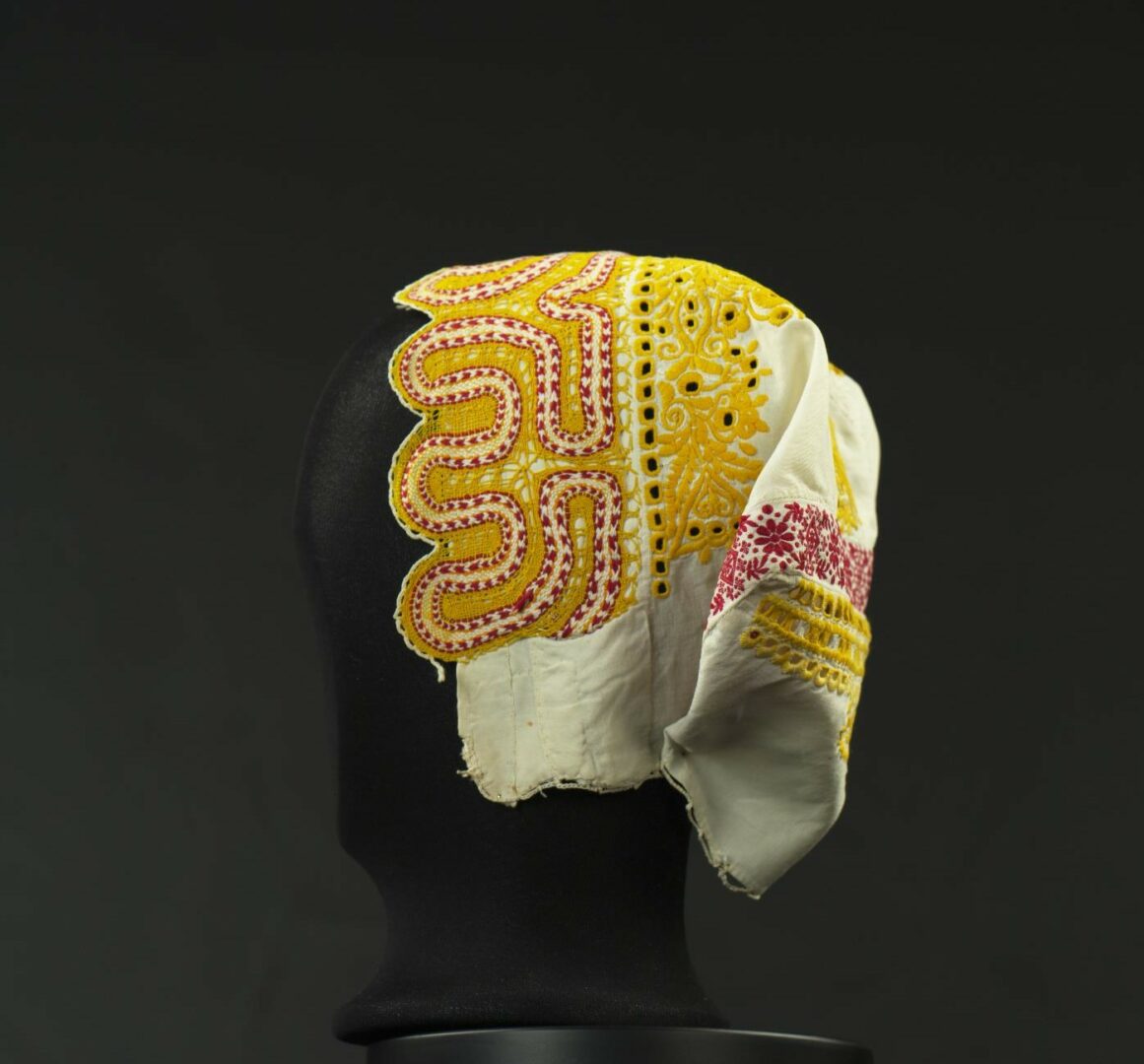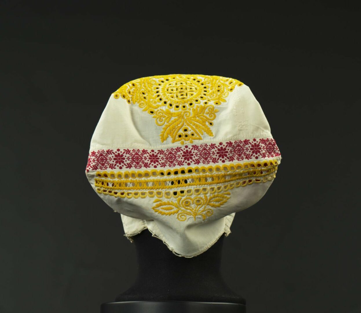Čepiec z bavlneného šifónu je vyšitý plnou a dierkovou výšivkou, na dienku je vyšitá aj hrachovinka. Výšivka je šitá bavlnenou priadzou. Dienko je s prednou časťou zošité pomocou továrenskej tkanice. Čelenku tvorí pásiková paličkovaná čipka.