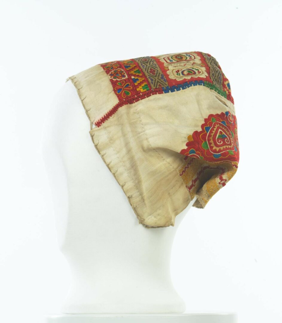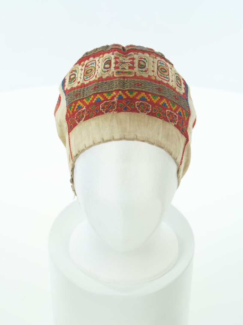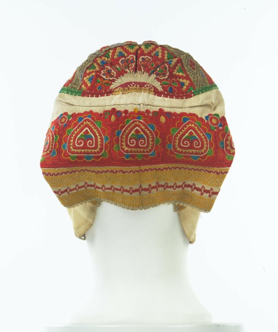 Čepiec z továrenského plátna má výšivku na dienku a na prednej časti. V strede dienka je výšivka šitá cez hodvábnú červenú stuhu. Stuhu z oboch strán lemuje našitá tkanica z kovových nití. Výšivka je šitá hodvábom vyrobená je podľa predkreslenia, zároveň využíva šitie po niti. Výšivka je šitá plochým stehom, retiazkou a stonkovým stehom. Dienko je s čelenkou zošité spojovacím švíkom. Čelenku nad čelom lemuje paličkovaná čipka.
