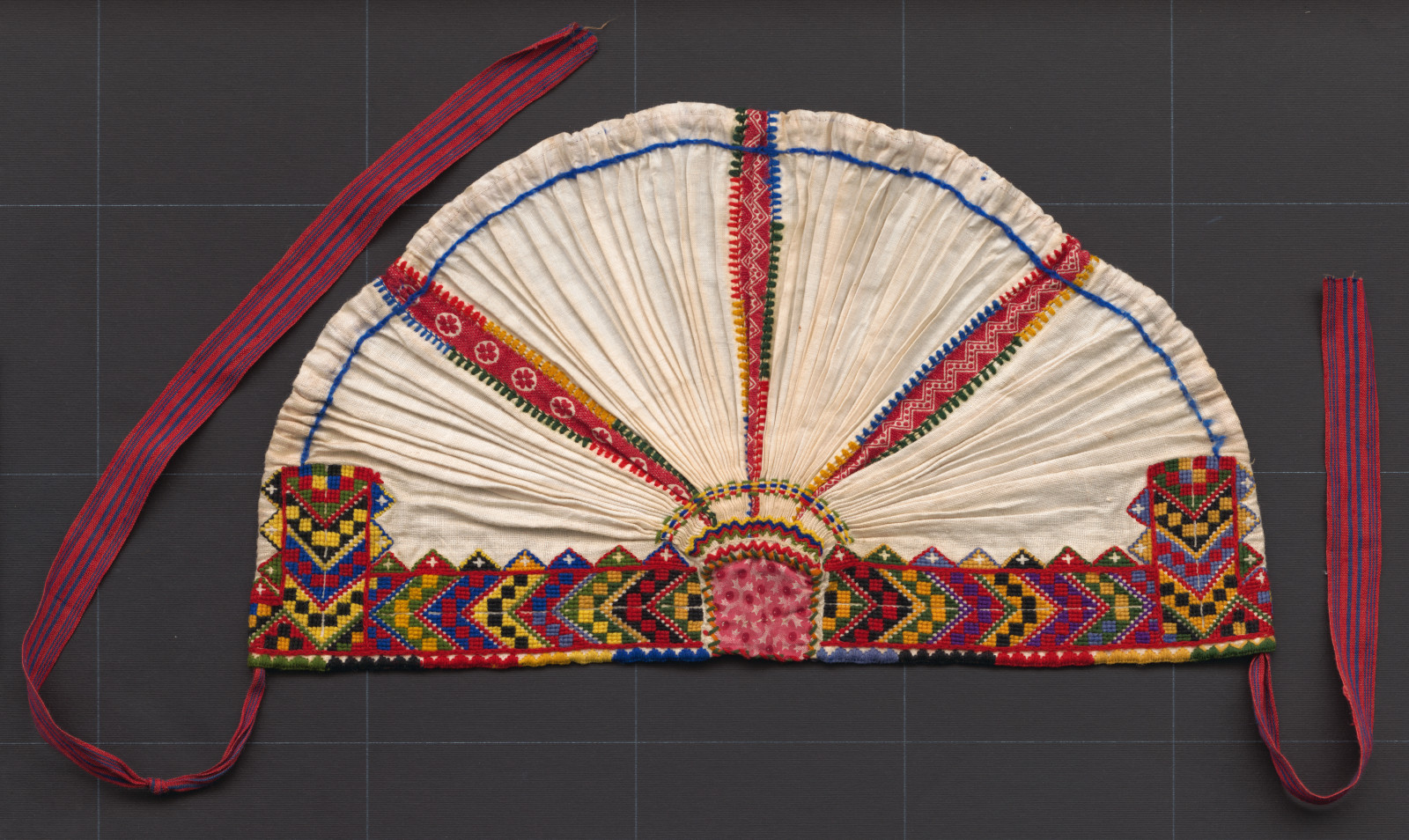 Štyri pravouhlé časti továrenského plátna sú zošité za pomoci tkaníc spojovacím švíkom. Horná časť je nariasená a zošitá zo štvorčekom kartúnu, ktorý tvorí stred. Časť čepca, ktorá zakrývala prednú časť hlavy, je vyšitá krížikmi, retiazkou a slučkovacím stehom. Výšivka je šitá vlnenou priadzou. Dolná časť je zahnutá a je v nej navlečená šnúrka na stiahnutie čepca.