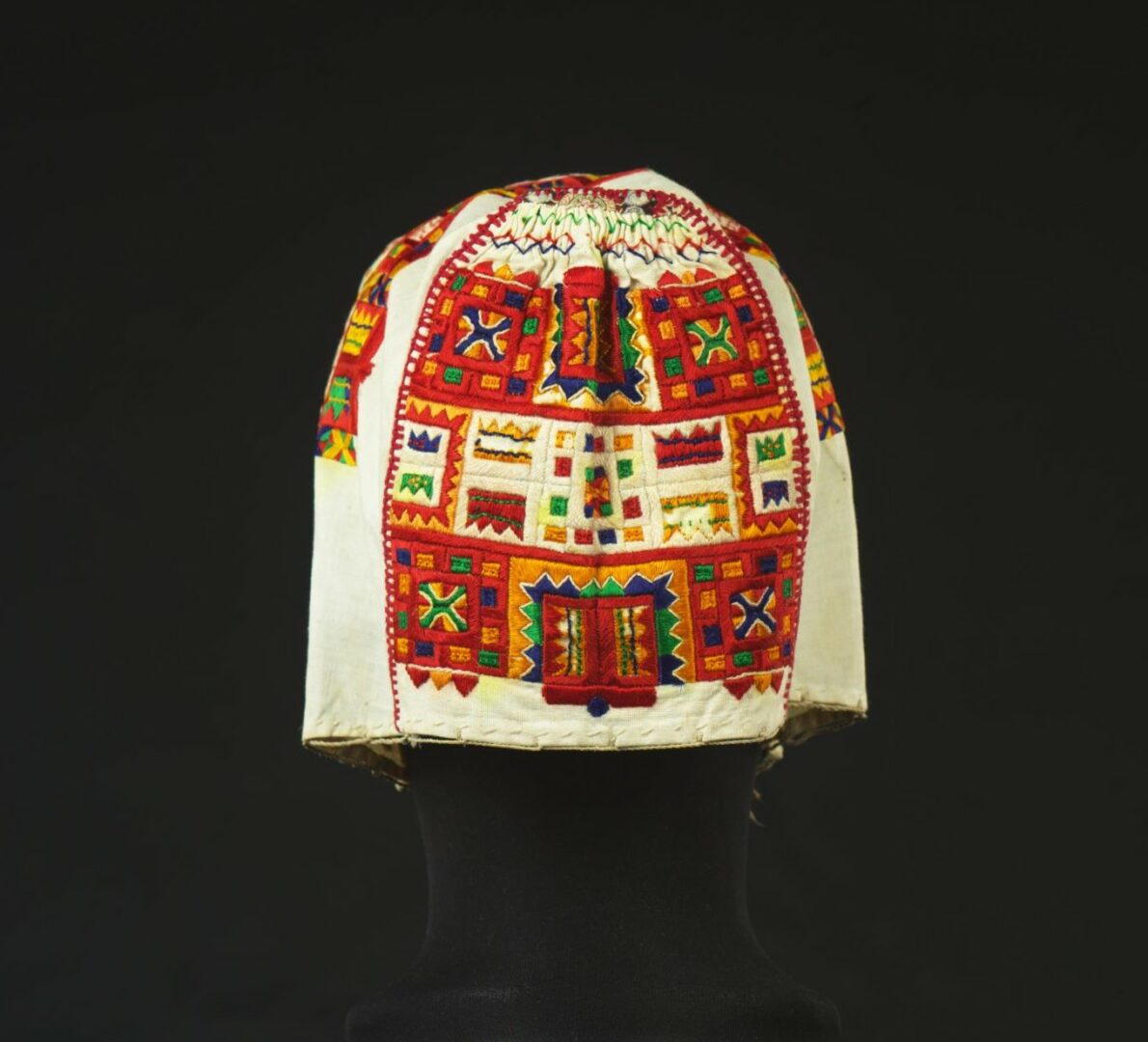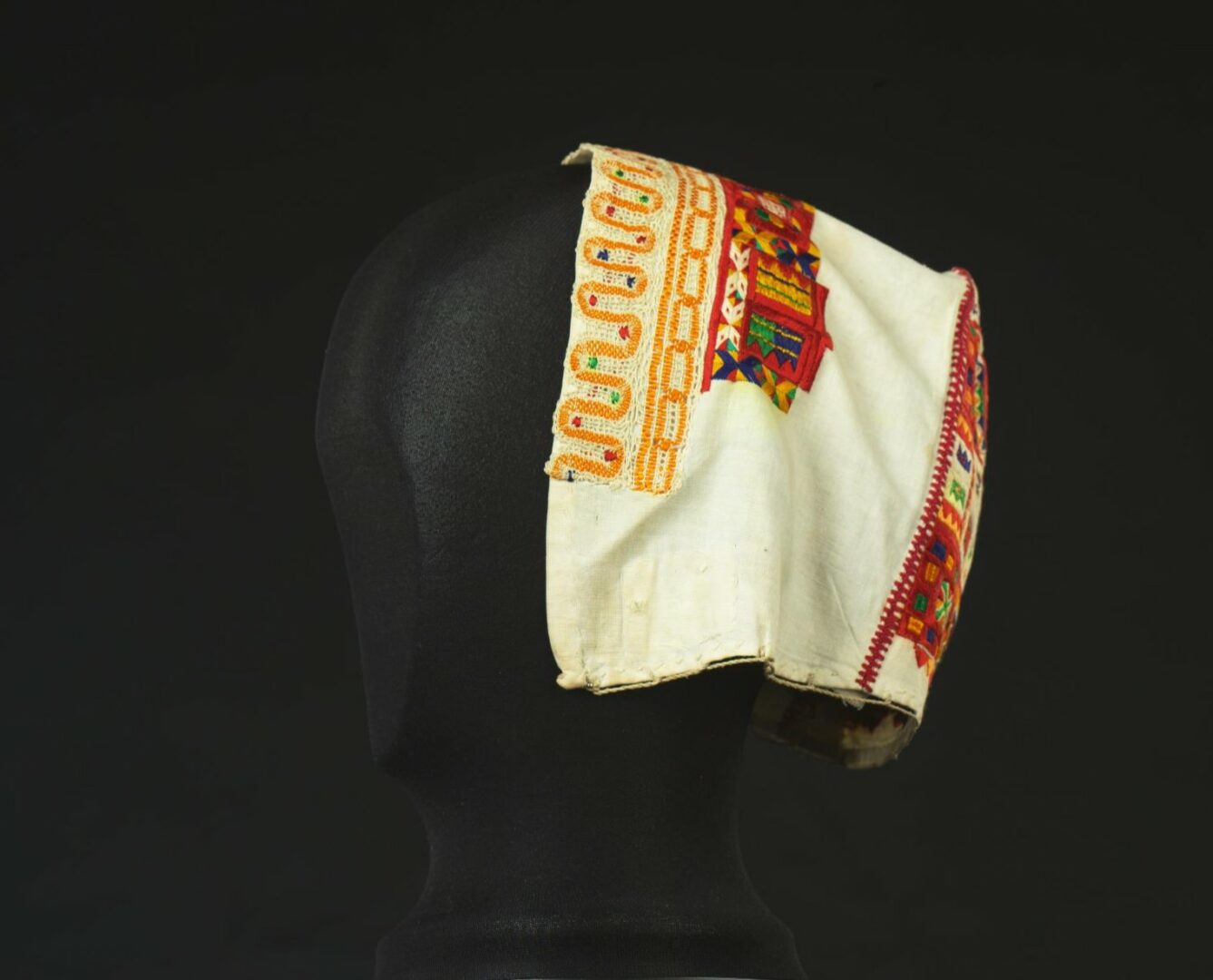 Čepiec z tenkého továrenského plátna má výšivku na dienku aj na prednej časti. Šitá je bielou bavlnenou priadzou a farebným nezosúkaným hodvábom podľa niti. Použitý je plochý steh. Čelenku tvorí pásiková paličkovaná čipka, ktorá je tiež z bavlnenej nite a farebného hodvábu.