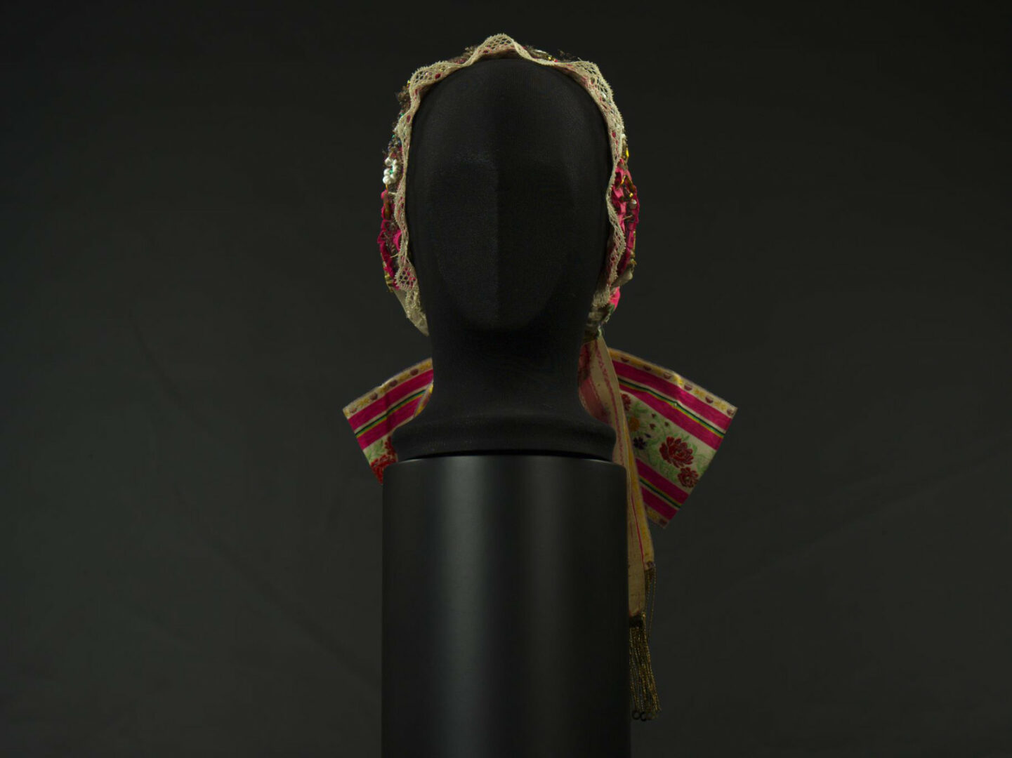Čepiec je zhotovený z bavlneného tylu, Takmer celý pokrýva nášivka kovovou niťou cez kartón. Prednú časť čelenky lemuje vláčková čipka a tmavoružová naskladaná stuha, na ktorej sú našité korálky a kovové ozdoby. Súčasťou čepca je kvetovaná stuha, ktorá je vzadu uviazaná do mašle.