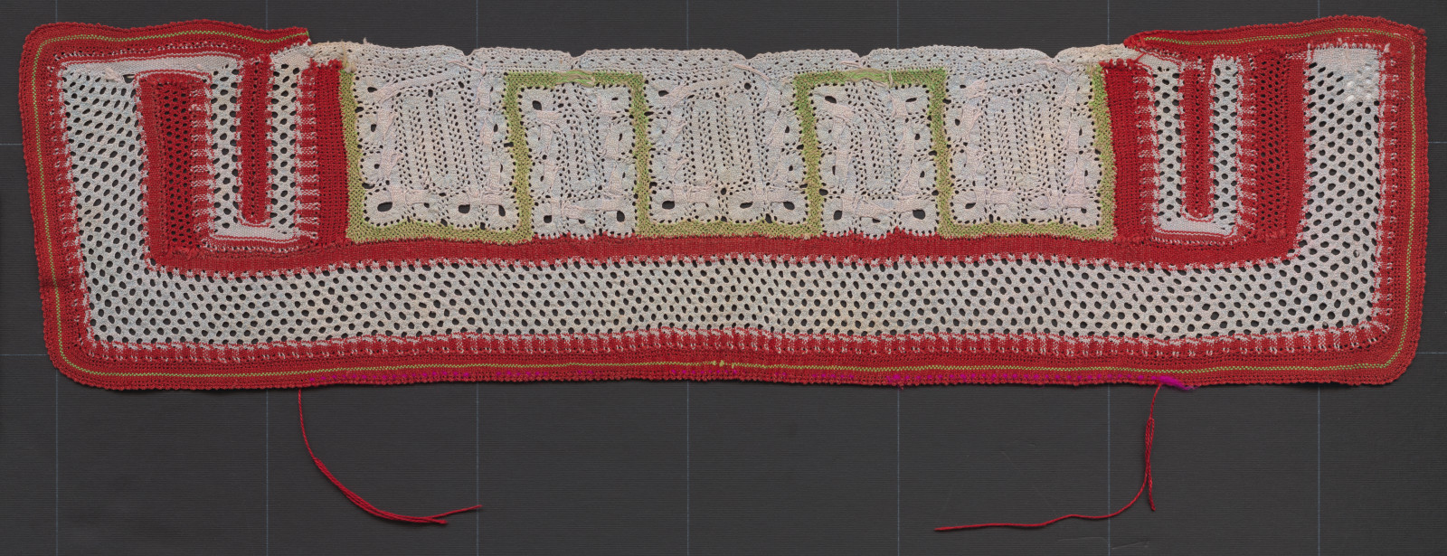Čelenka je upaličkovaná z bavlnenej priadze. Paličkovaná čipka je robená pásikovým spôsobom s použitím plátenka a dierok.