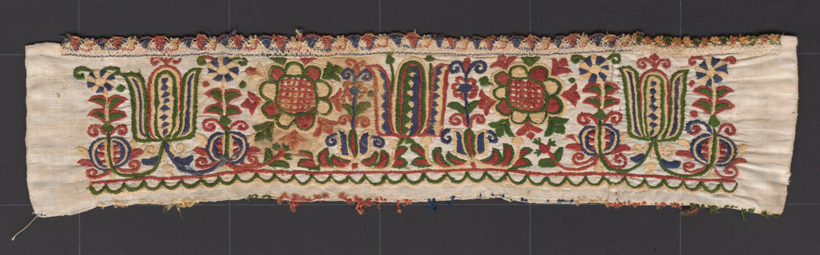 Na čelenke je predkreslená výšivka šitá nezosúkaným hodvábom. Predkreslený ornament je vyšitý plným plochým a stonkovým stehom. Na jednom okraji je našitá úzka zúbková paličkovaná čipka.