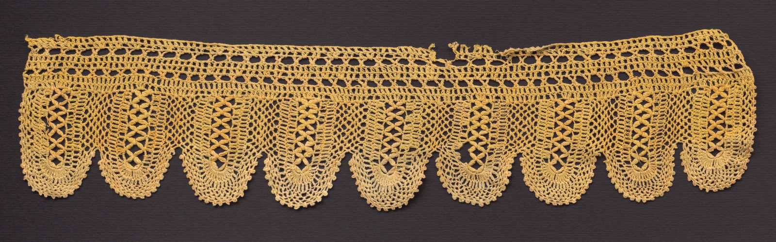 Háčkovaná čipka na čepiec z okolia Piešťan. Vyrobená je z zo žltých bavlnených nití. Vonkajší okraj tvoria oblé zúbky.