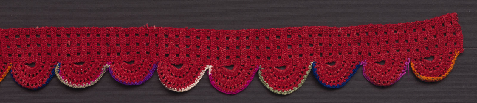 Čipky háčkované z červenej bavlnenej nite. Ukončené sú oblúčikmi obšitými retiazkovým stehom farebnými bavlnkami.
