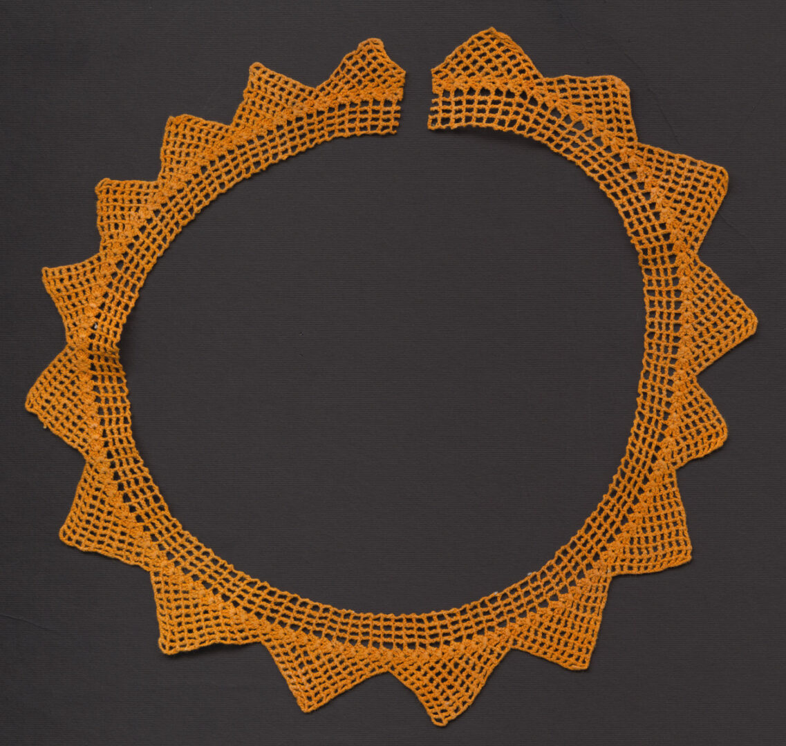 Háčkovaná čipka, golierik, z oranžových nití, ukončená zúbkami v tvare trojuholníka.
