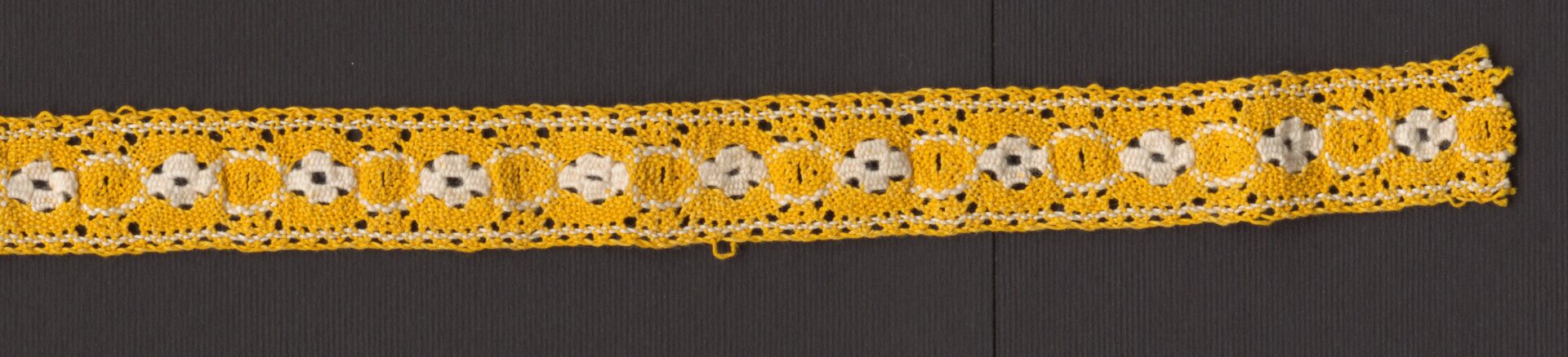 Mnohopárová vložka z bavlnených nití žlej a bielej farby. V strede čipky sa strieda motív pavúčika so štyrmi ploštičkami.