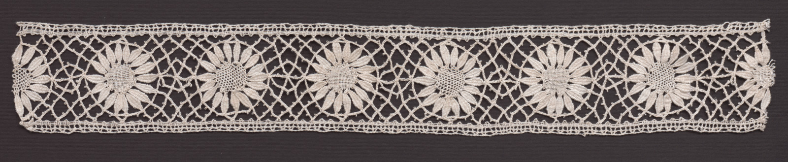 Paličkovaná čipka, motív kvetov. Materiál biele ľanové nite na paličkovanie, väzby dvojpárové pletence, obe plátenká, lístky a pikotky/mitky.