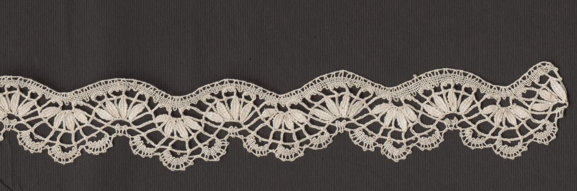 Paličkovaná čipka. Materiál biela bavlnená niť na šitie, väzby pletence, plátenko, lístky a pikotky/mitky. Čipka má tvar vlnovky.