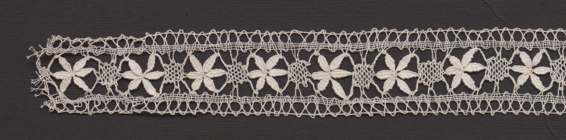 Paličkovaná čipka, netypická. Materiál biela bavlnená niť na šitie. Väzby plátenko, polpára, lístky, pikotky/mitky a dierky.