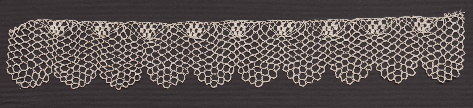 Paličkovaná čipka upletená z bielej bavlnenej nite, väzby pletence a ploštičky.