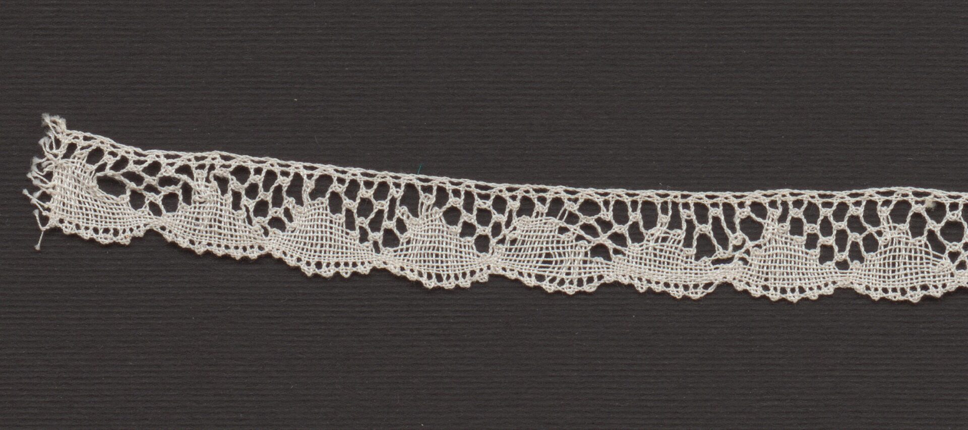 Paličkovaná čipka, učňovská. Materiál biela bavlnená niť na šitie, väzby plátenko a pichaná.