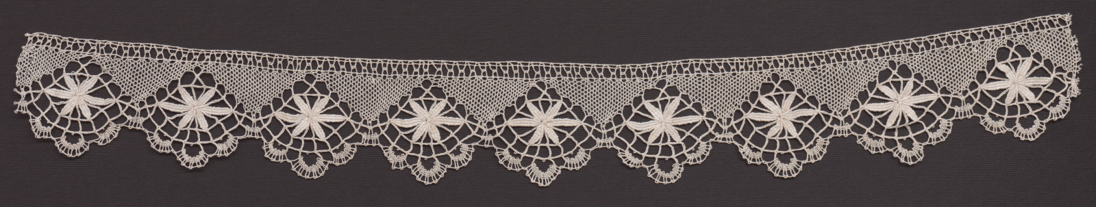 Paličkovaná čipka, netypická. Materiál biela bavlnená niť na šitie. Väzby dvojpárové pletence, plátenko, polpára, lístky a pichaná.