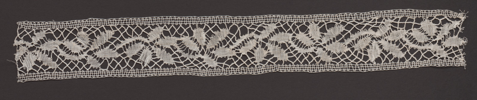Paličkovaná čipka mnohopárová, motív lístov. Materiál biela bavlnená niť na šitie, väzby dvojpárové pletence, plátenko.