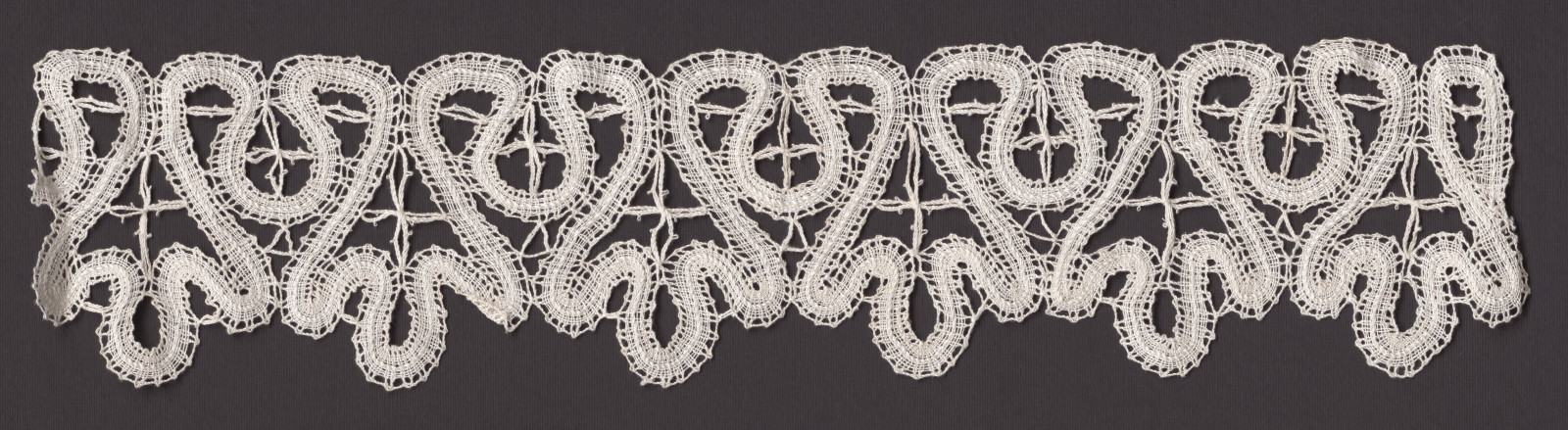 Pásiková paličkovaná čipka. Materiál biele ľanové nite na šitie a bavlnené nite na vyšívanie. Väzby dvojpárové pletence, plátenko hladké, polvrkôčik a mitky.