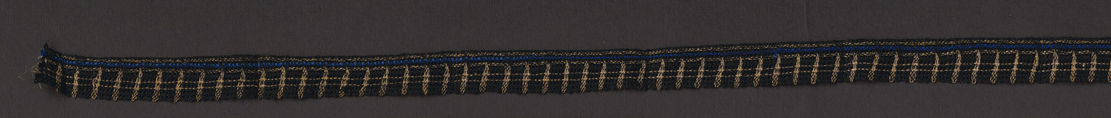 Paličkovaná čipka, typ slovenskogrobský. Upletená je z čiernych bavlnených a strieborných kovových nití.