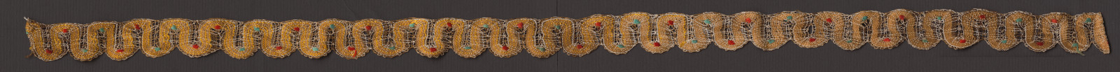 Pásiková čipka, typ slovenskogrobský. Materiál žlté a hnedé hodvábné nite, väzby plátenko a pletenec. Vo vnútorných oblúkoch pásika sú vyšité ploštičky zeleným a červeným hodvábom.