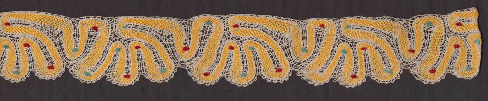 I. Pásiková čipka, typ slovenskogrobský. Vzor husie šľapky zo žltej hodvábnej nite. Do vlnovky sú zelené a červené ploštičky. II. Pásiková čipka, typ slovenskogrobsky. Vzor husie šľapky zo žltej hodvábnej nite. Získané zo Spolku pre zveľaďovanie domáckej výroby.