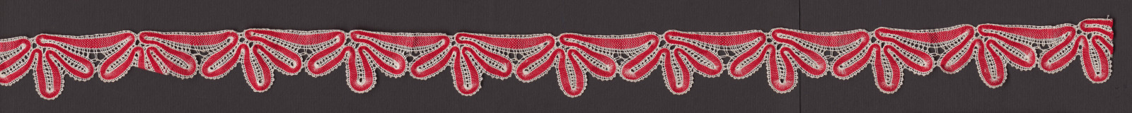 Dve rovnaké pásikové čipky, vzor tzv. “ na husie šľapky“, typ slovenskogrobský. Materiál biele a červené bavlnené nite, väzby plátenko a pletence.