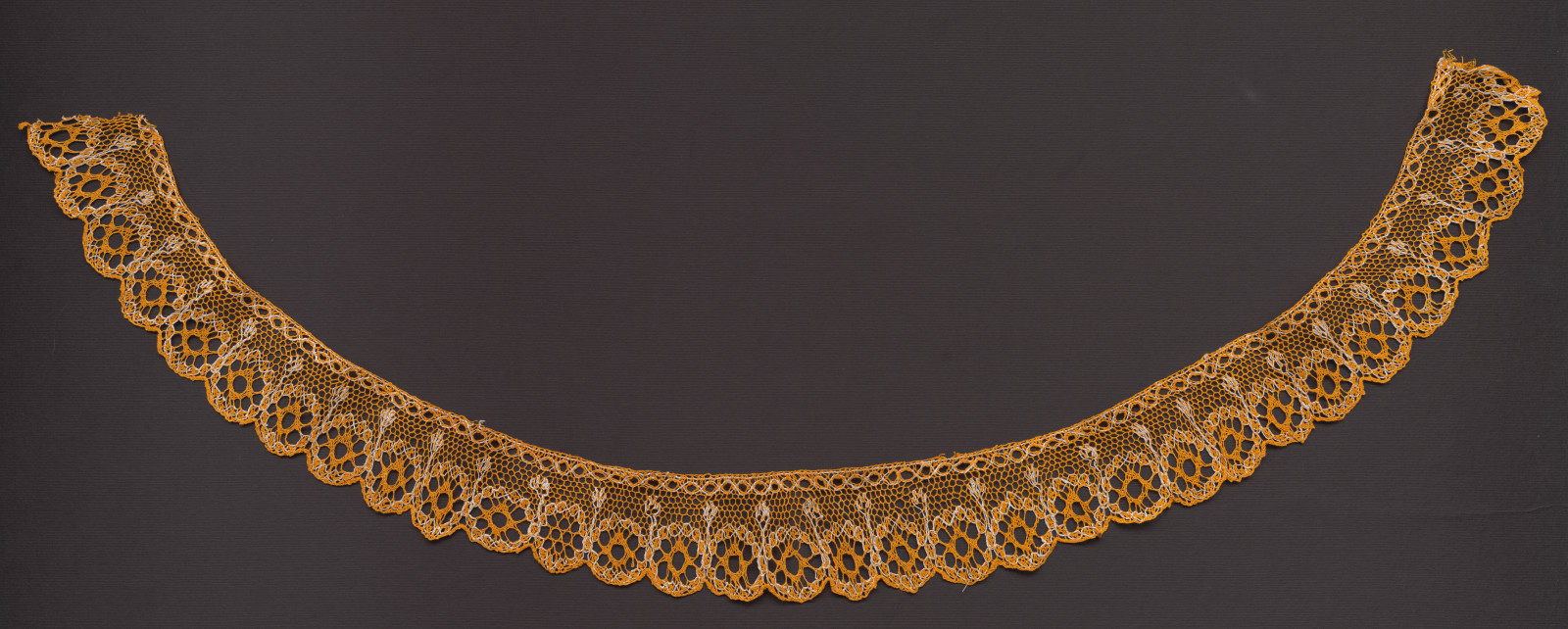 Mnohopárová čipka so zúbkami, typ piešťanský. Materiál bavlnené nite, väzba tylová, do ktorej je pletená hrubšia biela niť s rastlinným vzoro. Zúbky majú veľké oká.