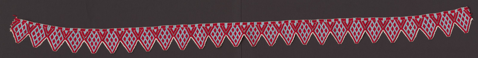 Mnohopárové paličkované čipky so zubami, typ piešťansky. Materiál bavlnené nite, motívy geometrické zložené z hustého úpletu ploštičiek.