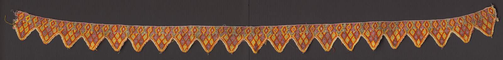 Mnohopárové čipky so zúbkami, typ piešťanský. Materiál bavlnené nite farby červenej, žltej a ružovej a strieborné kovové nite. Čipka je pletená z ploštičiek, ktoré sú husto ukladané vedľa seba do tvaru kosoštvorcov.