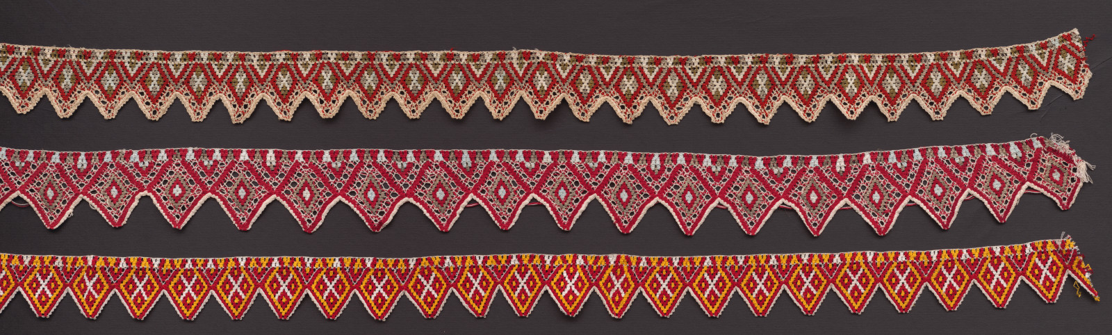 Mnohopárové paličkované čipky so zubami, typ piešťansky. Materiál bavlnené a kovové nite, motívy geometrické, zložené z hustého úpletu ploštičiek.
