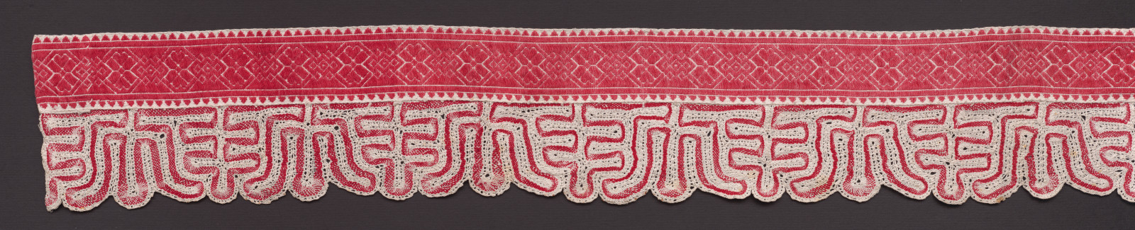 I. Pásiková čipka, typ slovenskogrobský. Materiál biele a červené bavlnené nite, väzby plátenko a pletence. Na vnútornom okraji je prišitá továrenská tkanica. II. Pásiková čipka, typ slovenskogrobský. Materiál biele a modré bavlnené nite, väzby pletence a plátenko.