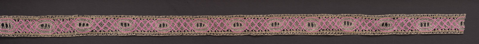 Mnohopárová vložka, typ slovenskogrobský. Čipka je upletená z kovových nití, strieda sa na nej motív pavúčika so s motívmi kosoštvorcov, ktoré sú vytvorené ružovou hodvábnou niťou.