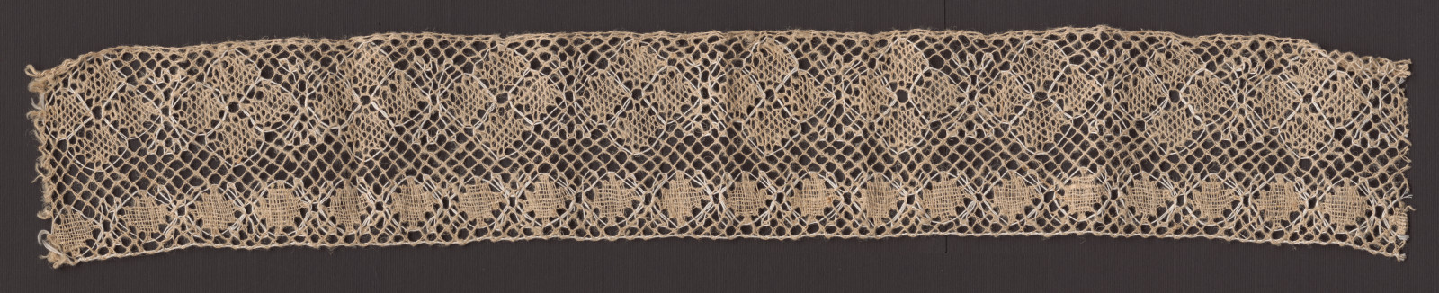 Mnohopárová čipka, typ špaňodolinský. Materiál konopné nite, väzby polpára, jednopárový pletenec, plátenko, vplietanie hrubšej nite. Motív štvorlístkov.